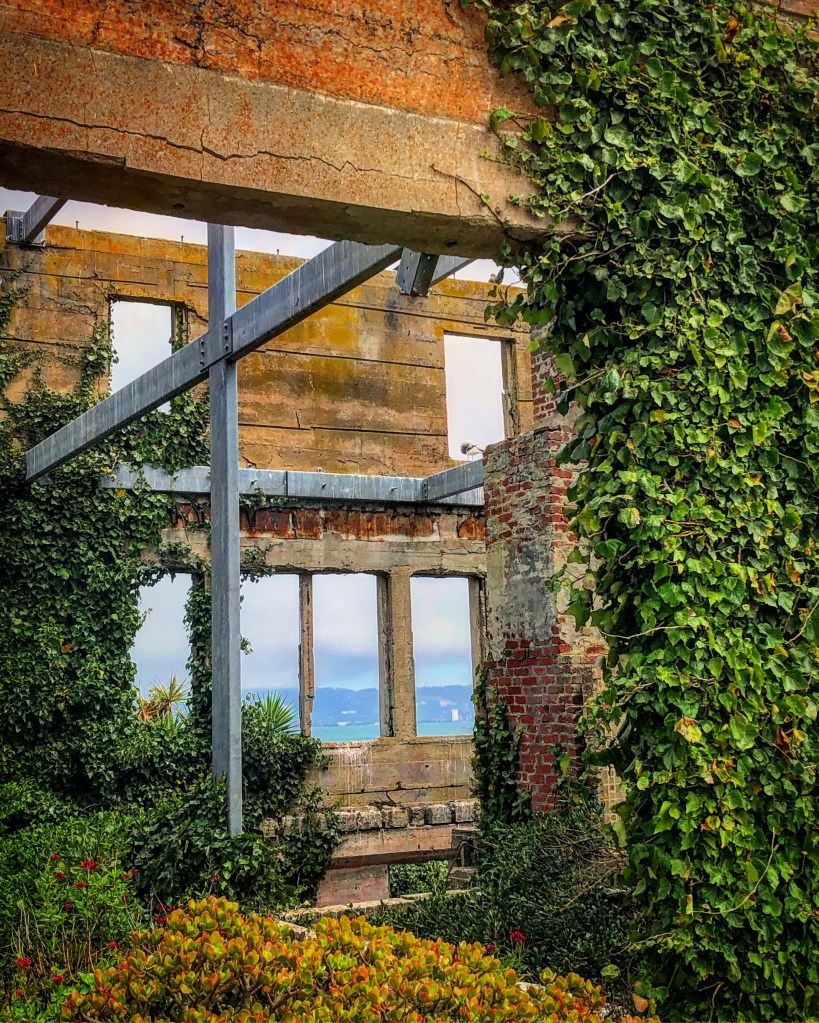 When you get outside and see the view from house that used to be the prison warden’s, the beauty of the city of San Francisco and the ocean mesmerizes you. This is why I want to use bigger size photos here. Below you will see the warden’s house, which is pretty much destroyed and has become a host to different kinds of plant species.