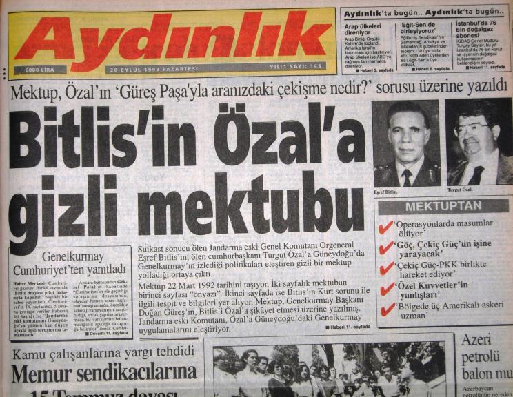 As General Commander of the Turkish Gendarmerie, Esref Bitlis supported the plans of President Turgut Özal to resolve the Kurdish–Turkish conflict by peaceful means. But when he started to feel like there were some games in play, he was not quiet about it. Here, I will mostly summarize it from Wikipedia: “A week before he died, Bitlis met the foreign ministers of Syria, Iran and Iraq to discuss Özal’s peace plans. He was also investigating an issue which journalist Uğur Mumcu, assassinated in January 1993, had been working on, namely the funnelling of 100,000 rifles from Turkey to Kurdish armed forces in Iraq. The Turkish Daily News later interviewed an army general who said that the commander of the Joint United States Military Mission for Aid to Turkey (JUSMMAT) had complained about Bitlis to the chief of staff for collecting information about illegal activities pertaining to Operation Provide Comfort (OPC). Other OPC officers also complained to Washington. Bitlis aggressively opposed American designs; he had allegedly dismissed Americans supporting the Turkish Gendarmerie as well as CIA agents operating from humanitarian organizations active in the region. The interviewed general said that Bitlis had discovered arms intended for Jalal Talabani and Massoud Barzani concealed in crates purportedly containing food. According to another source, Bitlis was given photographs taken by JITEM operatives depicting three OPC helicopters distributing materiel to the PKK on 10 December 1992. Such acts led Bitlis to conclude that America was intent on establishing a Kurdish state encompassing Turkey. Bitlis proposed to solve the PKK conflict by severing its logistical support. To this end, he suggested establishing relations with neighboring countries.”